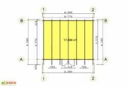 La toiture de l’abri de jardin en voliges de 20 mm est recouverte de feutre bitumé et dispose d’une avancée de 60 cm en façade. Les dimensions extérieures de l’abri sont de 4,99 x 3,99 m (l,L). Les dimensions intérieures de l’abri sont de 4,73 x 3,73 m (l,L). Les dimensions extérieures hors tout de l’abri de jardin sont : 5,20 x 4,60 m (l,L). Votre abri de jardin de chez Eurovudas est livré en kit, à monter facilement soi-même, avec une notice de montage détaillée et fournitures associées.