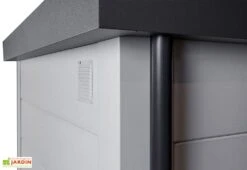 Côté couverture, cet abri de jardin s’est vue doté d’un toit plat (inclinaison du toit : 2°) constitué de panneaux sandwich isolés de 4 cm d’épaisseur. Il pourra supporter une charge de neige maximale de 220 kg/m² et intègre un système de gouttière avec descente conçu pour assurer le bon écoulement de l’eau de pluie pendant et après une averse.