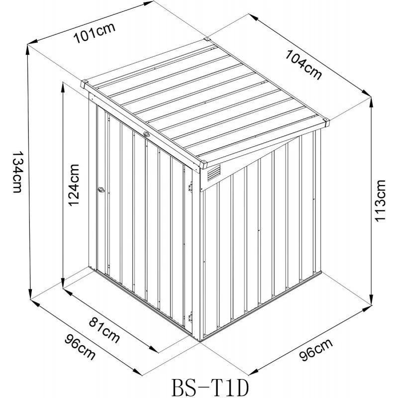 L’ouverture peut s’effectuer par un portillon (81x124cm) situé sur la face avant pour sortir la poubelle ou en soulevant le couvercle pour une utilisation régulière. L’ouverture du couvercle est facilitée par un vérin, et elle provoque l’ouverture automatique du couvercle de la poubelle au moyen d’une chainette avec crochet. La toiture monopente est dotée d’une pente accentuée pour faciliter un écoulement optimal de l’eau de pluie et une évacuation naturelle de l’amas de neige. Elle peut supporter une charge de neige maximale de 100kg/m².