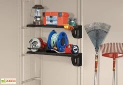 L’abri a une double porte de 3,9 cm d’épaisseur et qui mesure 138,5 x 191 cm. Les parois ont une épaisseur de 1,6 cm et font 1,87 m de haut. L’abri a un aspect bois et est équipé d’un plancher, d’une fenêtre de 43 x 61 cm, d’une ventilation et de portes verrouillables.