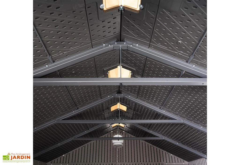 La toiture de cette remise de jardin repose sur une charpente en acier inoxydable et compte deux pans imitation tuiles, pour un écoulement efficace des eaux pluviales. Elle intègre également des puits de lumière afin de vous offrir, en complément de la fenêtre présente sur l’une des parois, un peu de luminosité au sein de l’abri. La double porte présente en façade se chargera pour sa part de faciliter d’accès à l’intérieur de la cabane, même avec du matériel relativement encombrant.