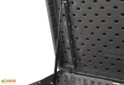 Très pratique, ce coffre de rangement extérieur est doté d’un couvercle monté sur vérins et d’une double porte frontale permettant de faciliter le stockage des objets relativement encombrants. Cette double porte lui permettra par ailleurs de faire office de cache-poubelles, ce dernier pouvant accueillir deux bennes. A noter également, la possibilité de verrouiller le couvercle ainsi que les portes afin de sécuriser le contenu du coffre (cadenas non inclus).
