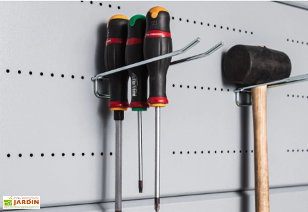 Spécialement conçu pour l’abri de jardin Luminato 5,6 m², ce produit inclut 18 crochets de 3 tailles différentes afin de pouvoir supporter vos outils et accessoires. A noter que ces crochets sont conçus pour supporter du petit outillage (3 kg).