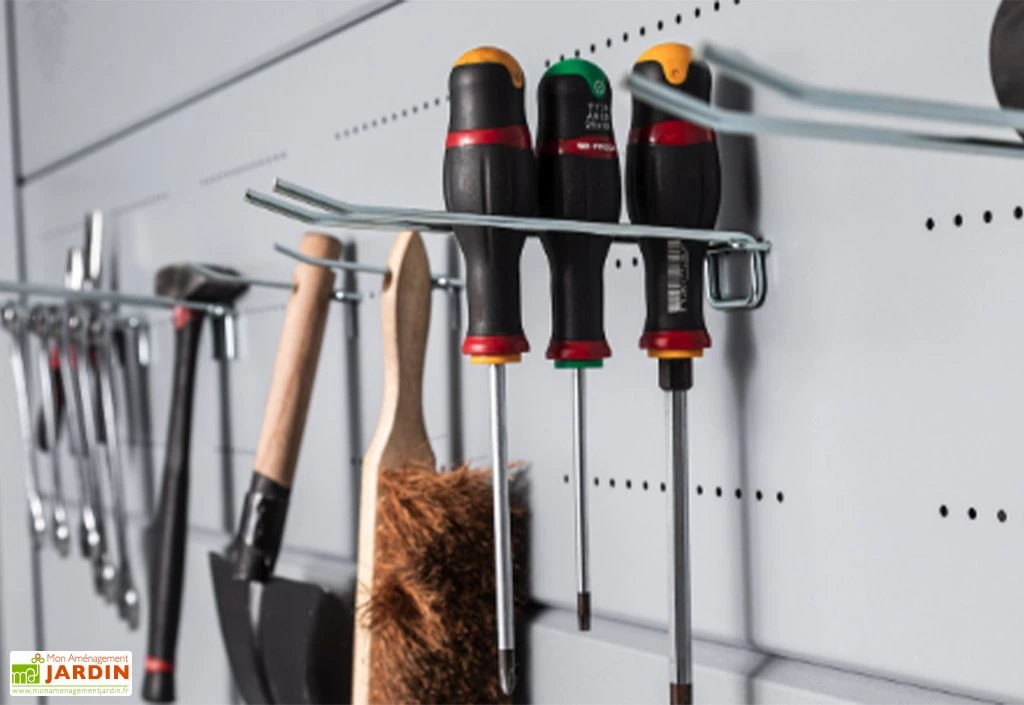 18 crochets de 3 tailles différentes sont inclus afin de vous permettre d’organiser votre rangement comme vous le souhaitez et optimiser votre espace. Pouvant supporter jusqu’à 3kg, ils sont conçus pour accueillir du petit outillage.