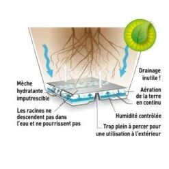 Diametre : 60 cm – Hauteur : 55 cm – Coloris : taupe – Volume terre / eau : 79 / 6 L – Fabrication française – Matiere : polypropylene – Systeme de réserve d’eau breveté Riviera – Utilisation intérieure ou extérieure – Visualisation du niveau d’eau grâce au voyant transparent et bille flottante – Design épuré.