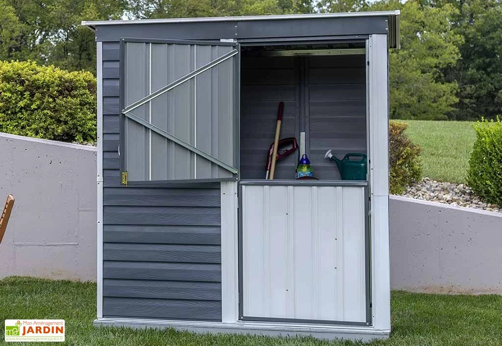 Cette remise de jardin de la marque Spacemaker offre un espace de rangement de 1,9 m², soit suffisamment de place pour entreposer des outils et du matériel de jardinage sans pour autant occuper une surface trop importante dans votre jardin (dimensions extérieures : 2,03 m de large sur 1,16 m de profondeur). Elle se montrera dès lors idéale pour les petits espaces et s’intègrera assez facilement dans tous types d’extérieurs, notamment grâce à sa finition gris anthracite.